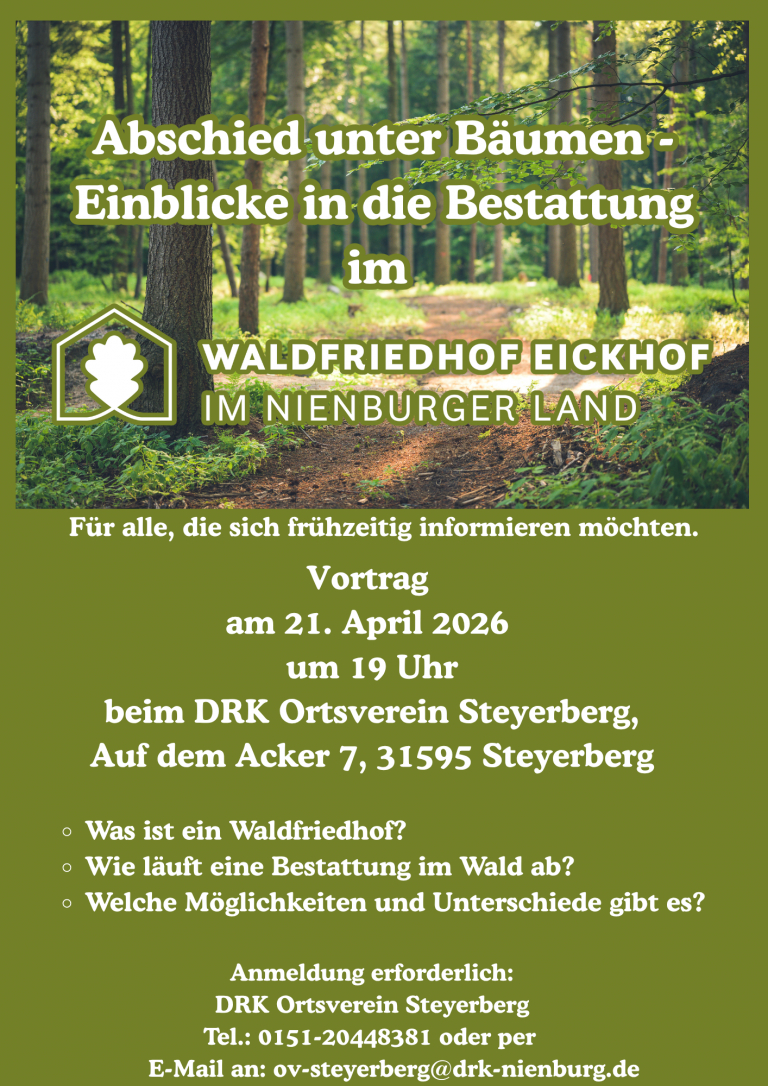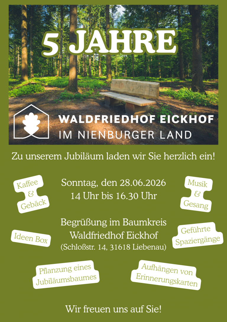 Der Waldfriedhof erstreckt sich über die Flächen des historischen Parkgeländes von Schloss Eickhof in Liebenau an der Weser. Charaktervolle Eichen und hundertjährige Buchen entlang idyllischer Wege bieten eine willkommene Atmosphäre, die zum Innehalten in der Natur einlädt.